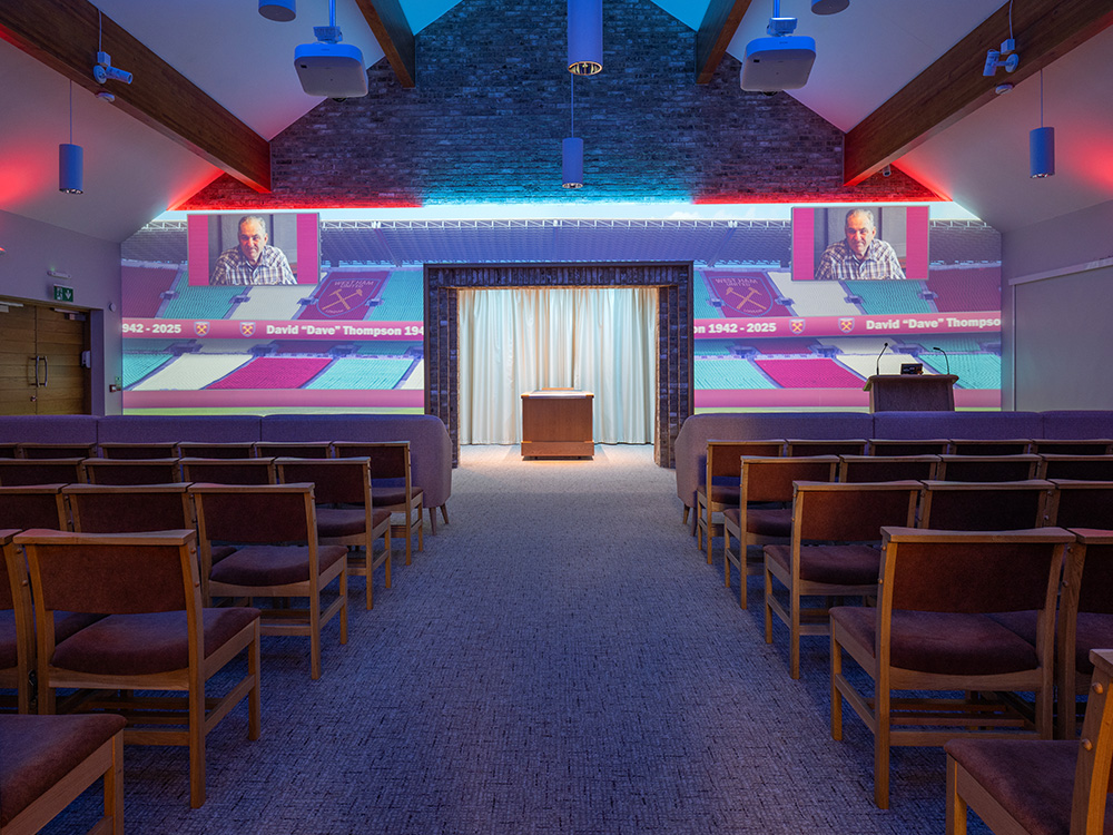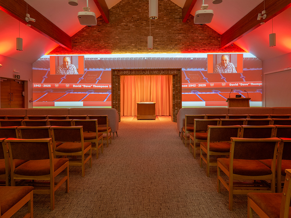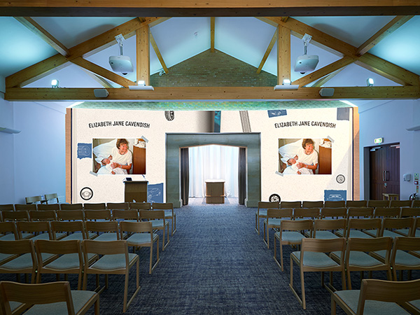 Where other UK venues can only provide visual tributes and photos of a loved one on chapel screens, our canvas wall serves as the entire visual tribute backdrop for a service.