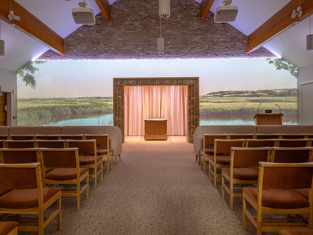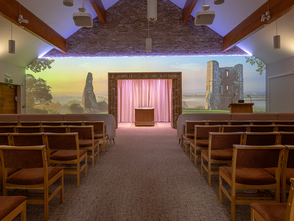 Our state-of-the-art media technology is able to transform the entire wall space around the catafalque into a themed backdrop (Canvas). High-spec audio equipment and customisable lighting enable families to enhance the canvas projections with carefully curated accompanying music and lighting, tailoring the whole chapel to reflect the life of the loved one being remembered.